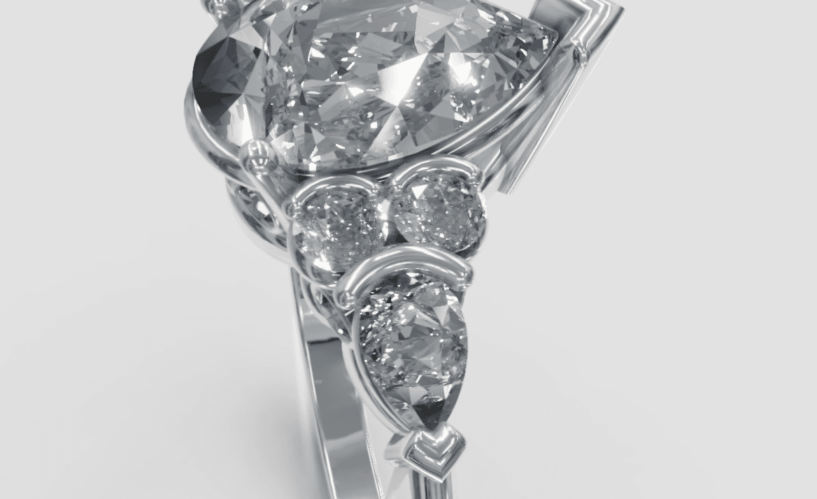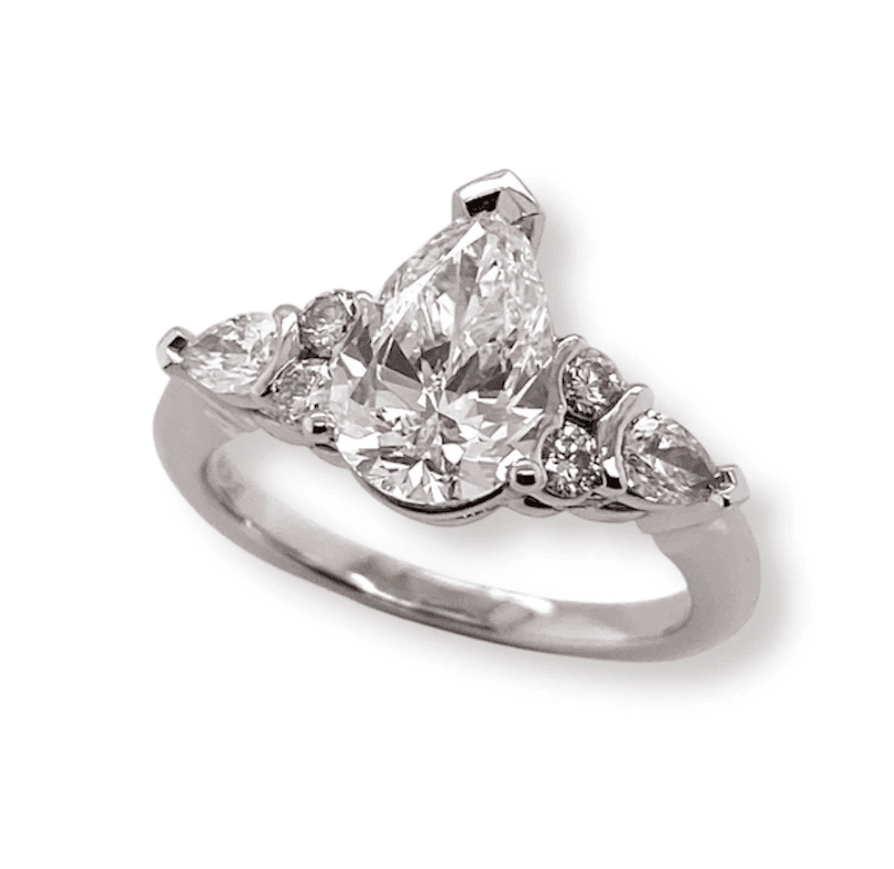 Protective prongs on the sharp edges of the pear shape center and side stones: