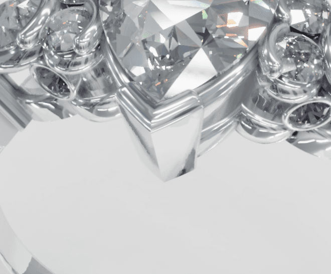 This platinum ring features: half moon bezels on the side round diamonds as well as the top of the side pear shape diamonds: