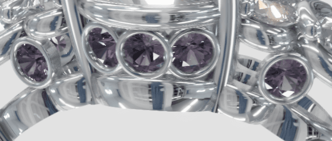 This customer wanted to incorporate lavender sapphires hidden on the band. We created several versions of the ring, and eventually decided on this design. He liked the half moon bezels, so each side stone has it's own half moon bezel. We designed each prong specific to the stone to match the curvature and fit all the hidden stones properly.